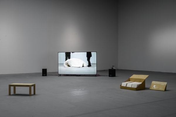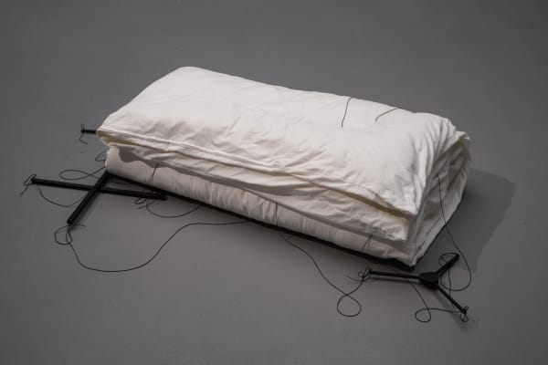 At times, as the exhibition title “Good night, see you later.” suggests, these locations point towards home. This intimate farewell is a reference to So’s parting words to his children when he sends them off to bed each night. When his children are awake, he plays the role of the father; when they are asleep, he may resume his role as an artist. As such, this unique phrase also signifies the compartmentalization of his different identities in daily life. However, when So prepares to retire for the night, not only must he return to his bedroom silently, he must also position his body in a manner that is suitable for falling asleep without disturbing the person sleeping beside him. The sleepless artist thus transforms himself into a living sculpture set upon a bed pedestal, as seen in Good night, see you later. The video work uses marionette puppetry to portray a figure squirming beneath a quilt, demonstrating the struggle of an artist/father who must contort himself to fit various roles in juxtaposition to his family.