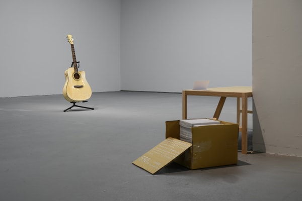 The work minus addition was initially scheduled to be produced on-site at TKG+ in mid-May. On the first day of production, So repeatedly smashed a guitar until it was shattered, leaving various traces of destruction along the gallery walls. However, that same day, the number of confirmed Covid cases in Taipei suddenly spiked from 29 to 180, forcing the artist to postpone his plans for on-site production. Because he was unable to continue working in Taipei, he took the guitar back to Tainan for repair. When he returned to Tainan to resume the course of his regular life, the restoration of the guitar became his primary focus. For So, this guitar that was destroyed in an instant, but required a tremendous amount of time and effort to restore to its original appearance, not only filled the gap left by his impeded production plans, but in the aftermath of the outbreak, opened up a consistent channel of bizarre remote interactions that are inevitable during times of self-isolation.