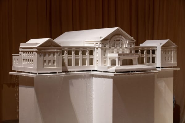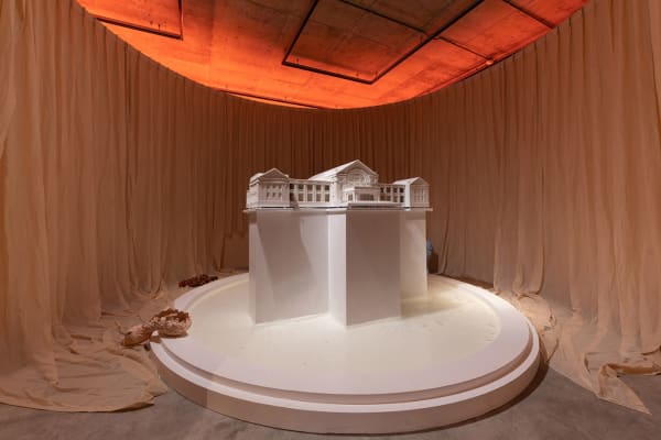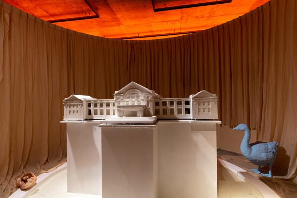 Upon her father’s retirement, Kuo and her family left the Zhongxing New Village in Nantou, Taiwan, where she grew up. Stirring a deep attachment to objects and light in her old home, her departure inspired her to search for her roots through art making. In Delay and Pit (2013), memory as an analytic approach of inquiry is used not only for the quest for her identity, but also for the investigation on how structural changes in politics cast an influence on local developments in the course of modernization. The Zhongxing New Village is a delayed projection of KMT’s then “Nanjing Capital Project” back in China. The policy of “infrastructure first” results in significant insufficiency in all other aspects, such as a deserted cultural scene. A new work Is Waking Up (2019), on the other hand, can be considered a hybrid representation of Kuo’s memories — pouring rain and a sewage system with waste water running through, on top of which stands the Zhongxing Auditorium, an architecture of the 50s that looks like a bomber aircraft from a bird’s eye view. It is an allegory of modernity telling the story of a lost plane. It is, too, the artist’s spatial memory of her hometown. Encircled by wooden walls yet present in the exhibition space, the enormous object’s ostensible invisibility closely corresponds to the artist’s state of mind.