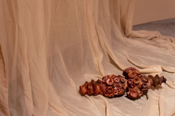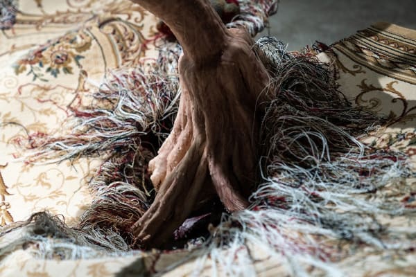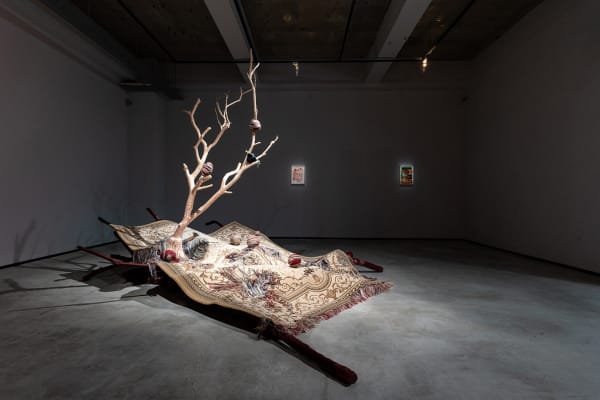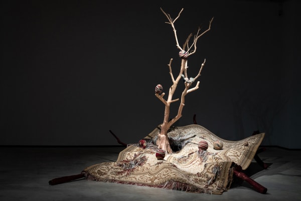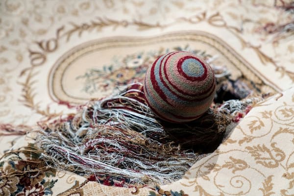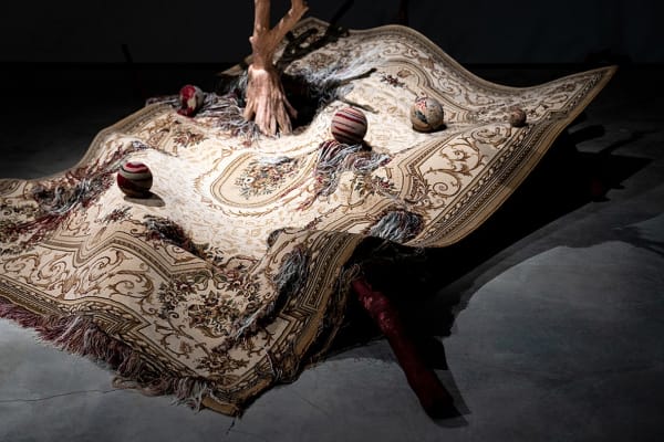 Starting in 2016, Kuo began dismantling a piece of carpet in an extremely prolonged, self-torturing, and neurotic manner. Through repetitive and almost ritualistic manual labor, she carefully pulled the threads apart, loosened the wool, and turned them into numerous solid pom-poms. Over time, her body developed a movement pattern most efficient for the task. She could stay in the same position for hours with both arms being the only body parts that frantically moved. It is as if the whole body was isolated in a vacuum, without growing or aging. Continuing the trajectory of Kuo’s artistic practice, this piece of carpet, as an object echoing the motif of ceaseless labor, is part of the sound installation Sleep, Dream, in a Feverish Land (2018). The work attempts to capture the essence of human existence — perpetually engaged in activities of sleeping, eating, and laboring (both physically and mentally). The sound of dismantling carpet, of eating and sleeping, of emotional fluctuations, portrays the never-ending repetition in human life.