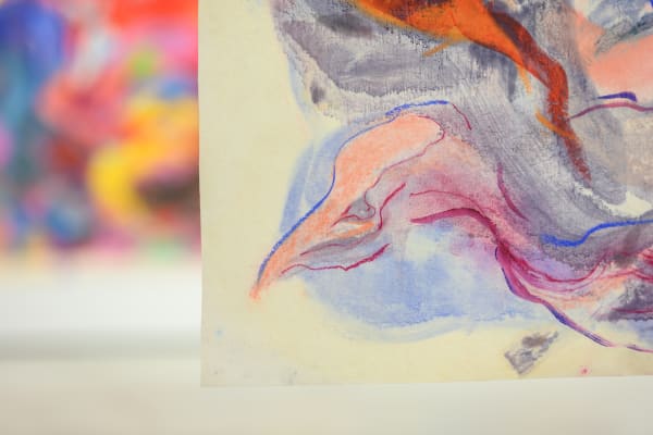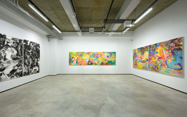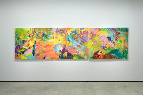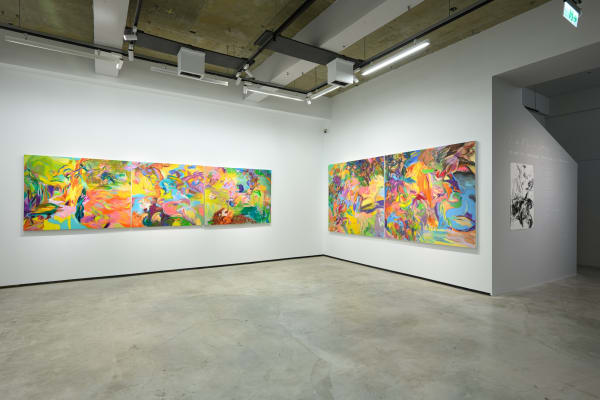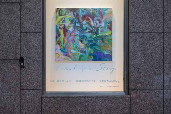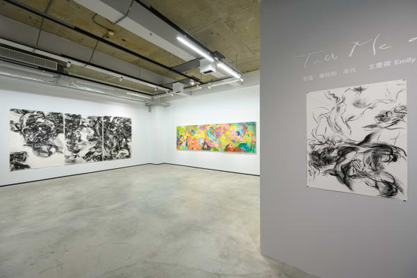 此次在 TKG+ Projects 的全新個展「 Tell Me a Story -在這瘋狂的年代」,多元衝突及矛盾的關係,依然扮演藝術家創作的關鍵角色,而作品內涵的複雜層次更加多重。除了視覺語彙的淬煉,藝術家更將其在準備個展、回顧整體創作歷程時所感受到呼之欲出的內在聲響,昇華為詩歌,同時梳理與凝聚整個創作歷程裡各個感官片段。尤其在 2020 年底搬到台灣東部小鎮後,詩意有如潮水浸潤她身上的每一個細胞,乃至片段的聲響終究浮出意識表面,迸發為文字語句。在其前往海邊的路上,與生命創作歷程相呼應的詩句滿溢而出。結合繪畫裡的彩料語言,她譜出感官的、寓言式的內在經驗。這如同她繪畫裡運用色彩關係,結合直接觀看與觀察、接受經驗與夢的引發等內外經歷後一再地將之轉化,目的在創造一種存在的新樣貌。交織著繪畫的視覺及詩性的語言,透過兩種異質媒材的相遇與碰撞,同時將展覽空間轉換為寓意發酵的空間。未完成的素描與詩篇並呈的入口處,更直指藝術家的展覽命題——對永恆世外桃源的渴望,如同素描未完成的缺憾;烏托邦的失落雖是事實,卻也意味著應許之地永遠可企及的可能性。