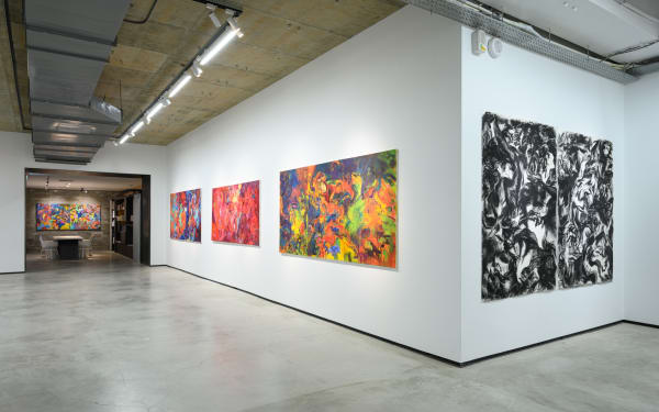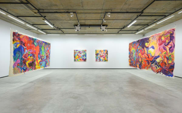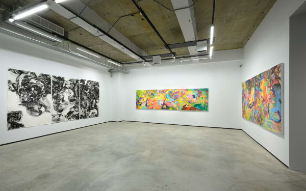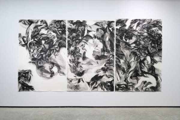 此外,展場上的兩幅大型雙面畫作 No. 51, Magnitude 11 (Take 1) - Birth of Venus 及 No. 54, Magnitude 11 (Take 2) - Forbidden Lili ,揭示了王慶蘋持續探索繪畫與素描可能性的強烈意圖。使用不同於以往的無酸紡織材料作為畫布,繪畫正面部分深沉的筆觸穿透了畫布,在背面自成為如洞穴壁畫般素樸的質感及肌理,卻結構完整的素描作品。輔以藝術家觀察展場狀態,轉譯到畫面的現地創作,畫作正反之間的對話,及色彩在穿透之間的蛻變,對於作品的動態張力及對話提供了嶄新的視角。