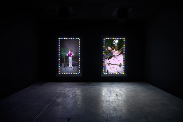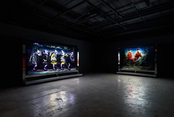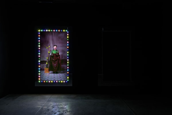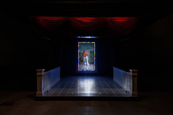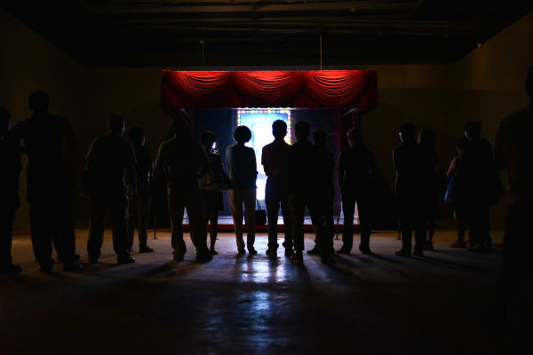 吳天章於此首度重現 2015 年威尼斯雙年展台灣館,完整展出《永協同心》、《瞎子摸巷》、《難忘的愛人》、《心所愛的人》與《再見春秋閣》五件費解又令人著迷的巨型作品。閱讀作品前建議先嚼食表象:吳天章不習慣留白,令人心生不快的任一細節都是他對台灣人集體潛意識的精心召喚。影像中鬼魅般的面孔往往帶著生理殘缺、過份精巧的皮膜仿若靈魂寄生的複體,二者造就生死並存的幻象,宛若國族式的集體欲望投射。一鏡到底下,魔術般的過場形同政權交替下的障眼法,背景音樂的台語老歌不經意地諷刺著台灣人的祖國眷戀情結,反映這座島嶼在長期殖民政權更迭下的集體記憶。在這裡,吳天章敘述的口吻有如詩人,他模糊空間與時序,撿拾意境,僅對生命直白。期待離別與再會之歌散去後,我們這一代人得以望見發炎的在地歷史,在晃蕩的時代裡握緊土地、別說再見。