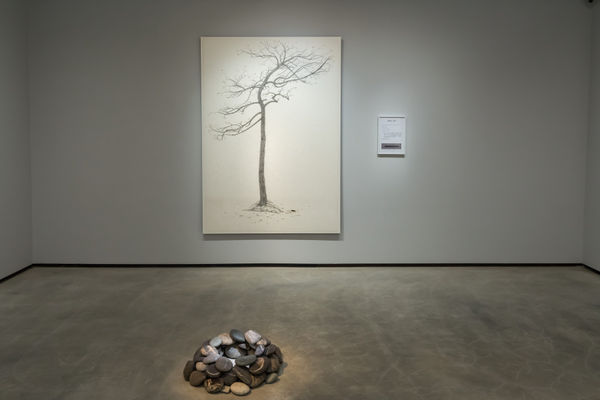 石晉華的創作總是緊緊聯繫著他的生命經驗,他試圖鬆動藝術與生活的界線,在創作與生活的同時,以一種可以藝術、可以生活的覺知與態度,使虛無的生命自創作中獲得熱情與動力,進而透過作品讓觀者領略生命的寓言與象徵,坦然面對生命的無奈與極限。展名「兩樹一山」直白地呼應本次展出的三件作品《犧牲樹》、《瑜珈樹》、《走筆 #160 (岡仁波齊峰轉山)》,三組作品橫跨二十餘年,大學時期所看的電影《犧牲》片中的樹與小男孩也以不同的階段狀態,出現在石晉華的作品中,他認養、修改電影中小男孩照顧樹的故事,卻沒預期到,這個小男孩與樹的「寓言」也將是他日後生命的「預言」;一開始他自覺是新故事的一位小僧,後來於加州留學期間,在每日做瑜珈與靜坐所面對的「《瑜珈樹」》樹幹上,發現一根深陷樹中的大鐵釘,進而覺知那棵樹其實也是自己,拔不出來的釘子就像是自身的疾病,無法拔除只能與之一同成長、生活;自美返國後,石晉華展開了「走筆」系列,以鉛筆的筆觸與耗損進一步象徵生命的痕跡與無常,他自比為筆的助理,在紙或畫布上走畫出各樣的筆觸與痕跡,協助筆完成一生的使命;延續這樣的人生隱喻,近年創作了「走筆」的「岡仁波齊峰轉山」系列,以鉛筆的身體朝聖、繞行出西藏的聖山岡仁波齊峰,在這個追求覺悟的朝聖旅程中,鉛筆越來越短,猶如行者逐漸揚棄對自我與現象世界的執著,無止境地進行精神的鍛鍊與解脫。